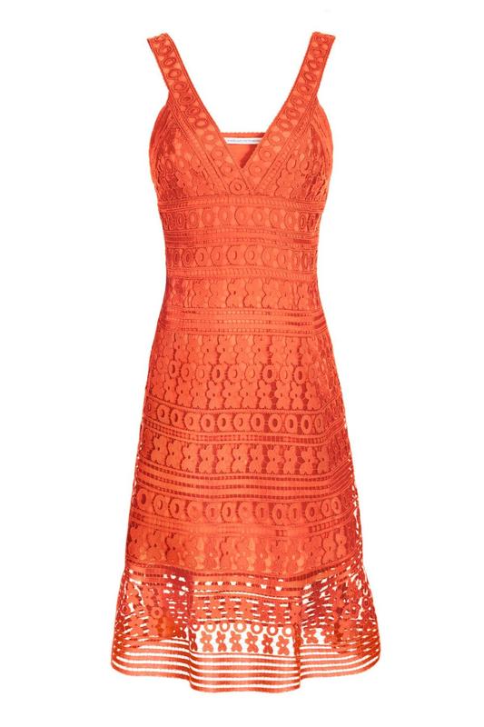 Просьба через кнопку КУПИТЬ оформлять после ❤ Кружевное платье миди, сарафан премиального бренда Diane Von Furstenberg Triana, размер 8. Платье в стиле Self Portrait, Sandro. Круги и цветы создают игривый узор на этом кружевном платье DVF. Шифоновая подкладка подчеркивает вырез и бретели. Прозрачный воланный подол, v-образный вырез горловины. Потайная боковая молния. Ткань гипюровое кружево. Очень красивый и яркий цвет апельсина. Подойдет на размер С-М. Состояние идеальное, новой вещи.