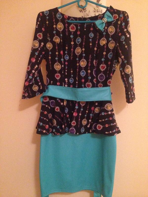 Дуже шикарна нарядна сукня, бірюзовий них та пояс. Четвертний рукавчик. Пояс та низ зроблений під шкіру.