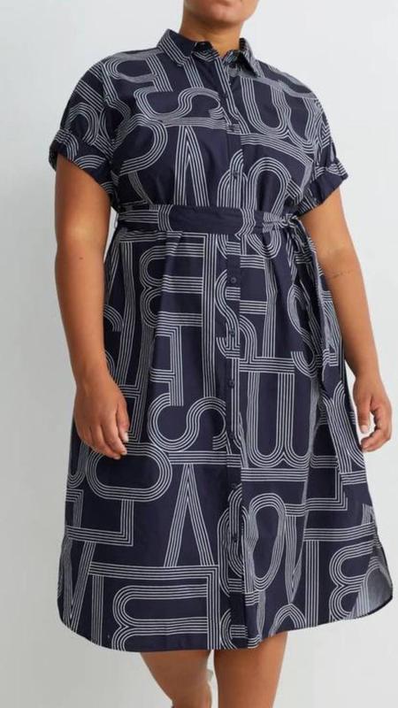 Платье-рубашка прямого кроя из воздушной тканой ткани с рисунком со спущенными плечами и фиксированными подворотами на рукавах. Два боковых прорезных кармана и пояс на талии. По бокам закругленные разрезы. Закрытие: застежка на пуговицы Длина миди. Размер 50-52/22, около XXL