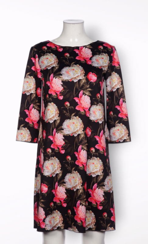 Женское платье черного цвета с ярким цветочным принтом ПОГ 46 см ПОТ 50 см ПОБ 54 см рукав 46 см длина 90 см ткань плотная, хорошо тянется