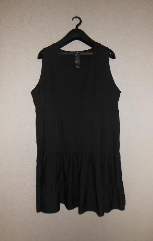 Стильна сукня – довга туніка шведського бренду Myleene Class – стильна і надзвичайно якісна річ!!! Розмір зазначений: 5XL (але див. заміри). Матеріал: м'який, легкий, приємний до тіла, злегка тягнеться, майже не мнеться (склад по бірці – 100% поліестер). Колір: глибокий чорний. ЗАМІРИ: Довжина – 100 см (від плеча до1-го ярусу – 40 см), Плечі – 40 см, плечовий шов –8 см, ПОГ – 66 см (тягнеться до 72 см), ПОТ (лінія першого ярусу) – 63 см (тягнеться до 71 см), ПОБ (лінія 2-го ярусу) – 79 см (тягнеться до 89 см), ПОНизу ≈ 150 см, Пройма – 29-30 см + тягнеться.
