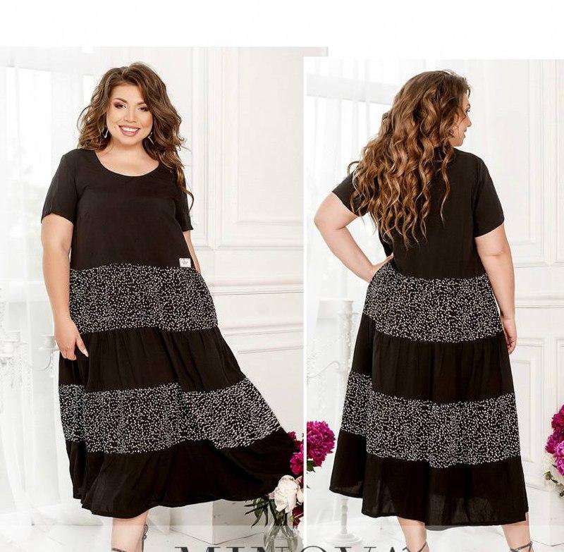 Сукня жіноча Тканина: штапель Розміри: 50-52, 54-56 Кольори: чорний Орієнтовні заміри готового виробу: 50-52 р-р: довжина сукні 120см, довжина рукава від плечового шва 22см, обхват рукава 40см, ОГ - 110см, ОТ -120см, OC -130см. 54-56 р-р: довжина сукні 120см, довжина рукава від плечового шва 22см, обхват рукава 44см, ОГ - 118см, ОТ -128см, OC -138см. нг