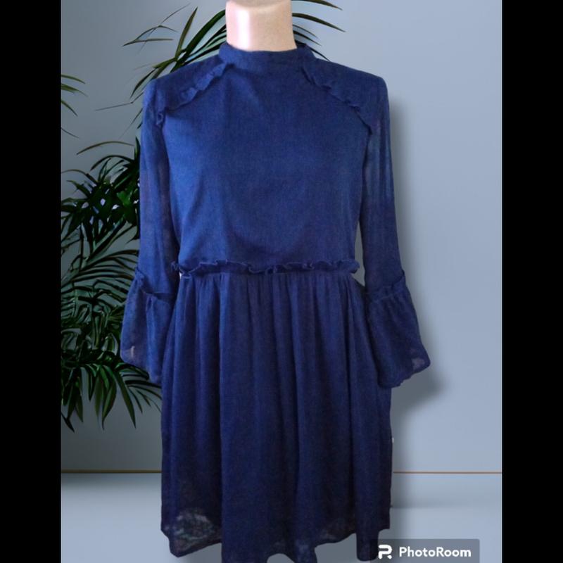 продам жіночу сукню темно-синього кольору вільного силуету ( в талії має бути вільно), відрізна по талії.Крміп стійка,рукав довгий( три чверті) ,десь від ліктя розширюються за допомогою волану.Біля плеча має невелику рюшу.Тканина легка, тендітна,фактурна Плаття має підкладку з синього трикотажу ( окрім рукавів) Стан ідеальний.Розмір вказано 12( М,L) Заміри Плечі 38 см Рукав 50 см ПОГ 47-48 см ПОТ 45-46 см Довжина виробу від коміру до низу 88 см Підкладка на 2,5 см вища, ніж довжина сукні.