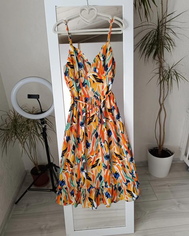 Платье миди в яркий принт💛🏵️ Романтический крой, легкая ткань (полиэстер и спандекс), размер S Состояние новой, бумажная этикетка отсутствует☝🏻 Замеры: Пог-42см; Пот-35см; Пос-67см(свободно☝🏻) Длина вместе с лямкой 117см(+-2-3см регулируется)