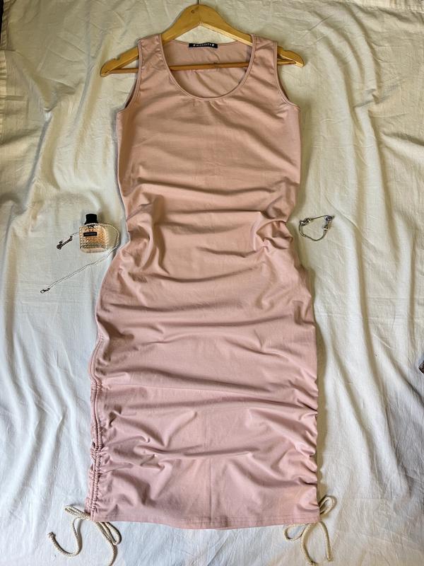 Трендовое платье-миди в пудровом цвете Идет со стяжками по бокам, длина регулируется Шикарно садится по фигуре Материал приятный к телу и качественный, не просвечивает Размер м, очень хорошо тянется Стан Идеал Пог 43-53 Длина максимум 115