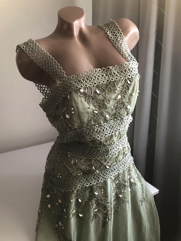 Розпродаж! При замовлені і оплаті в той же день, - роблю додаткову знижку! Неймовірно красива сукня бренду Аsos, виглядає розкішно. В ідеальному стані (стан нової речі) має підкладку, а з верху сітоточка вишита бісером і дуже якісне мереживо. Довжина міді. Колір оливковий.