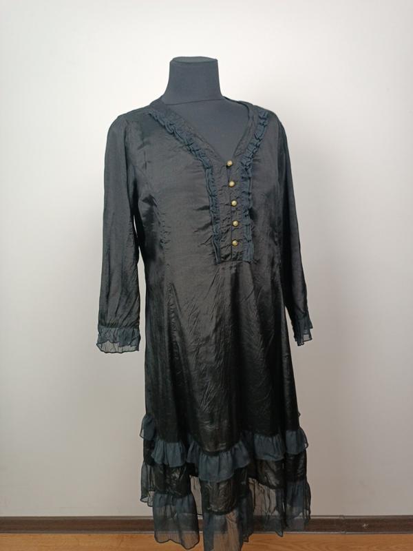лёгкое воздушное платье прямого кроя,ткань с блеском,оборки по рукавам и подолу из органов,есть нюанс сзади есть зацепка , видно на фото пог 56 пот 60 поб 68 длина 91