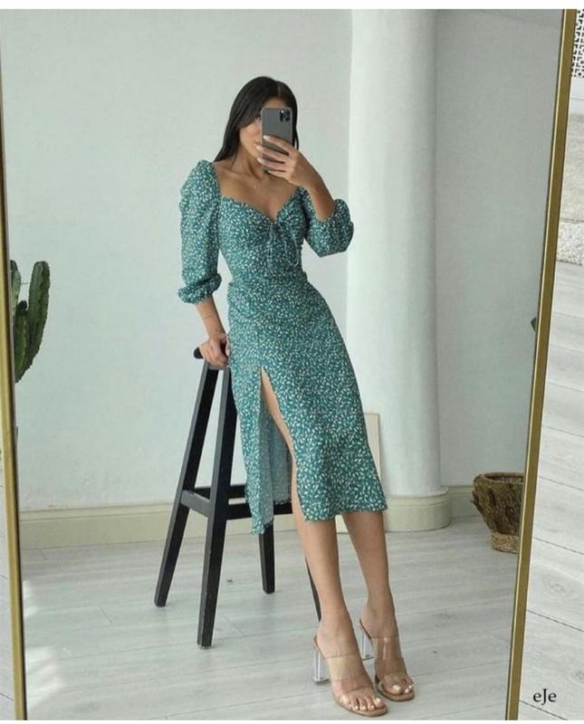 Нова сукня у розмірі С. Мій проліт з розміром. Буде краще на С-ХС. Тканина схожа на софт. Ідеальна для літа. Декольте можна регулювати за рахунок резинки вгорі. Довжина рукава також не фіксована. Збоку є потаємні змійка. Спереду розріз.