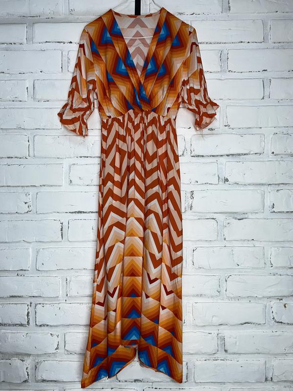 Яркое миди платье, состояние идеальное, есть незначительный недостаток, показанный наост.фото, на одном рукаве немного надернулась нить, которой овершили край, бирка со составом и размером отсутствует, ткань похожат на вискоз, размер М. Замеры; длина 121, плечи 37, длина рукава 32, ПОГ 42 потянется до 50, ПОТ 30, тянется до 47, на талии резинка, ПОБ 67