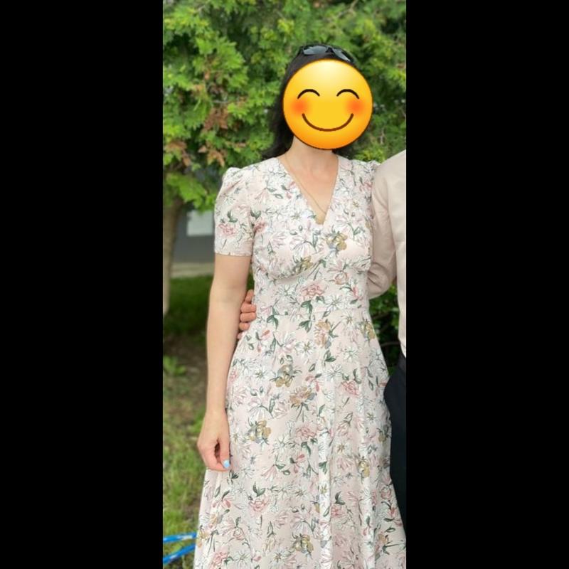 Нежное, легкое женское платье. Подчеркивает фигуру. Сзади на молнии. Стан идеален. Ткань слегка просвечивается. Цвет розово-бежевый в цветочный принт. Размер S/M/L. Ширина плечей 39 см Ширина груди 43 см Ширина поясу 36 см Длина от пояса 71 см, общая 113 см.