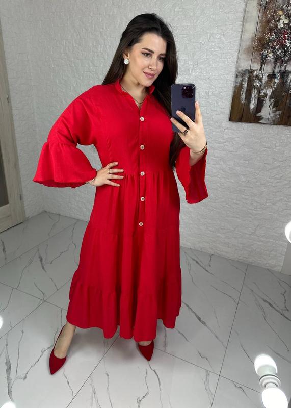 Платье Модель 959VL Цена : 1100 грн Размеры: 50-52,54-56,58-60 Цвета: красный, черный, белый Тканина : льон жатка Легкое летнее платье, очень свободного кроя с широкими воланами, застегивается на красивые пуговицы, рукав ниже локтя с воланом, Замеры по изделию: Размер 50-52: Объем груди 120 Объем талии 124 Длина рукава от шва 45 Бицепс 42 Плечи 39 Длина по спинке 130 Размер 54-56: Объем груди 126 Объем талии 130 Длина рукава от шва 46 Бицепс 42 Плечи 46 Длина по спинке 130 Размер 58-60: Объем груди 140 Объем талии 130 Длина рукава от шва 48 Бицепс 44 Плечи 49 Длина по спинке 130