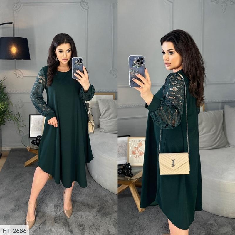 Платье HT-2686 Код 3689 Розмiри: 52-54, 56-58, 60-62, 64-66 Ткань: креп-стретч(растяжимость средняя) Цвет: черный, зелёный, т. Синий, бордовый, марсала. Длина платья: 116, 118, 120, 122 см. Длина рукава: 63, 63, 63, 63 см. Обхват рукава: 40, 42, 44, 46 см. Замеры изделия в готовом виде: 52-54 ОГ 112 ОТ 132 ОБ 162 56-58 ОГ 120 ОТ 140 ОБ 170 60-62 ОГ 128 ОТ 148 ОБ 178 64-66 ОГ 136 ОТ 156 ОБ 186 Стильное нарядное платье из трикотажа креп-стретч (растяжимость средняя). Платье трапецевидного силуэта, прекрасно скрывает любые недостатки фигуры и подчёркивает достоинства. Вырез горловины круглый. Рукава на манжетах, выполнены из красивого гипюра в тон основной ткани. Низ платья асимметричный. Застёжек, карманов нет.
