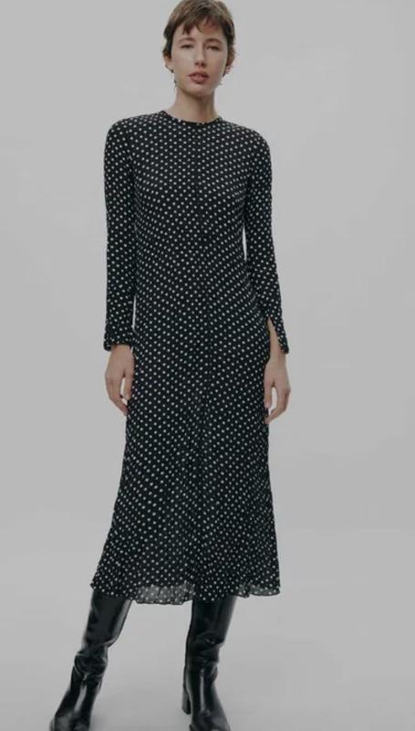 Платье миди черная, в горошек. Размер S. С разрезами на рукавах элегантна в стильная. Ткань 100% вискоза, жатка. Легкая, приятная к телу. Zara. Не одевалась ни разу.