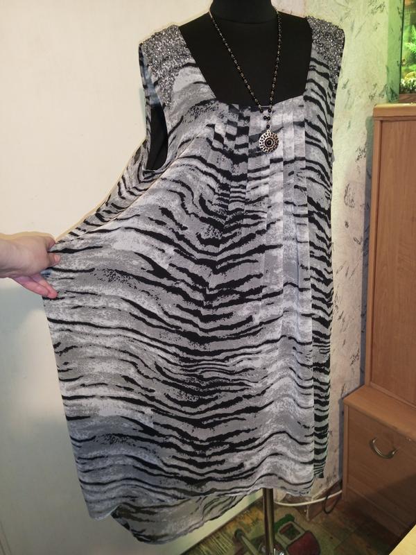 Лёгкое,нарядное платье-трапеция с удлинённой спинкой,серебристым декором на плечах,в актуальный принт,датского бренда FRANSA,Индия.Не светится,есть трикотажная подкладка,от горловины по центру вниз - складки.Цвета: серый,белый,чёрный. Размер на бирке 42, но ориентируемся по замерам: ПОГ- 51/55см, ПОТ - 60/70см; ПОБ- условно - 70см +; ПО по канту передней части-73см +; длина от плеча впереди - 94см,длина от плеча по центру спинки 112см,ПО проймы 27см В жизни -эффектнее,фото не передаёт. См.др.мои объявления-есть аналогичные блузы, куртки,пиджаки и много одежды большого размера. Подписывайтесь на страничку-очень много одежды больших размеров-каждый день обновления. Переспрашивайте,сделаю дополнительные замеры и фото.Возврата нет-объявления платные. Покупая несколько товаров-Вы экономите на пересылке,лоты комбинируются. Состав: полиэстр типа шифона Доставка: Перешлю в др.города-за Ваш счёт-при полной оплате на карточку