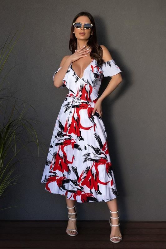 14678_белый/красный Бело-красное платье-халат кроя на запах с воланами на плечах и по горловине. Платье с V-образным декольте, тонким втачным поясом и расклешенным низом миди длины. Модель из хлопкового легкого штапеля с абстрактным принтом и тонкими бретельками.