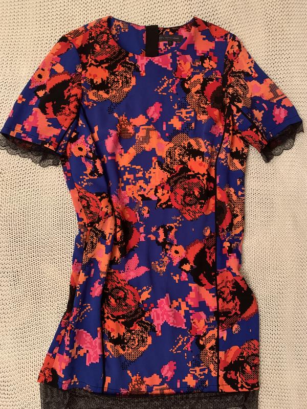 Яркое платье из плотного х/б трикотажа. Прямой силуэт. Украшена по рукавчику и по низу изделия кружевом.