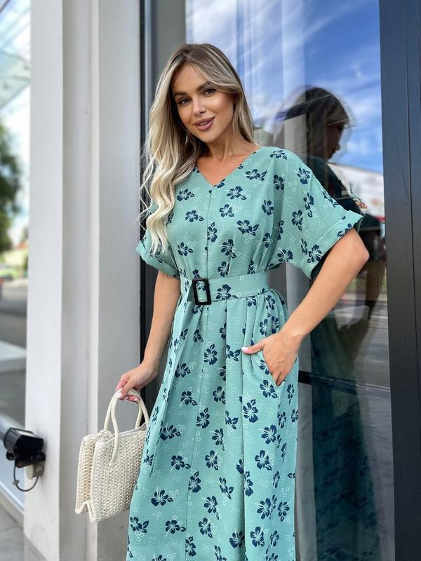 Сукня "Флору" Сукня прямого, вільного силуету, з цільнокроєними короткими рукавами внизу з відворотом. Виріз горловини V-образної форми. З поясом в комплекті! Матеріал: креп жатка принт Розміри: 46-48, 50-52, 54-56, 58-60 Кольори: м'ята, джинс, фрез