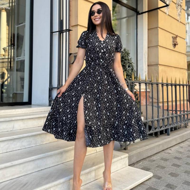 Платье миди с разрезом с пышной юбкой солнце расклешённое с короткими рукавами фонариками...