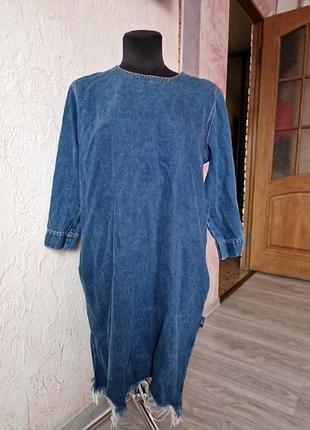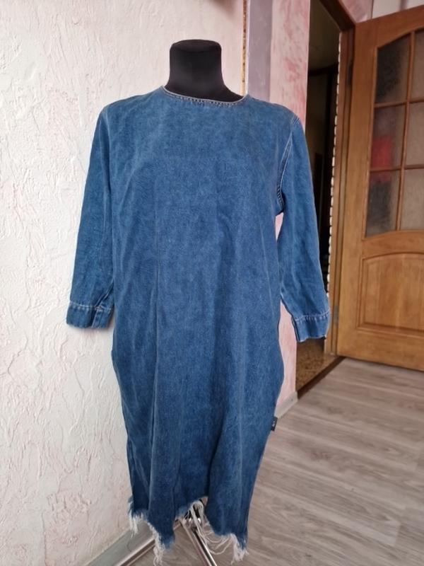 гарної якості джинсове плаття темно-синього кольору..внизу рване з карманами по бокам довжина 93см ширина під мишками полуобхват 56см довжина рукава 45см