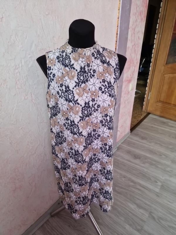 красивое из необичного гипюра платье с темно синими..белыми и бежевыми цветами..сзади на замочке длина 88см ширина под мышками полуобхват 53см