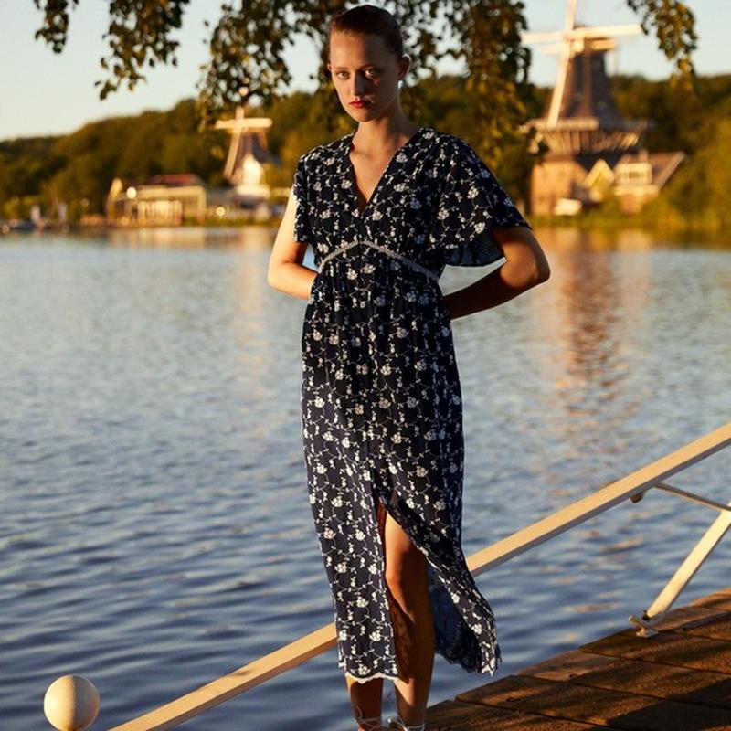 Катоновое платье темно синего цвета с вышитыми белыми цветочками.Застегивается спереди на пуговицах. На рукавах есть разрезы.Длина-122см,ширина между проймами-51см,ширина плеч-37см Ширина бёдер -60см