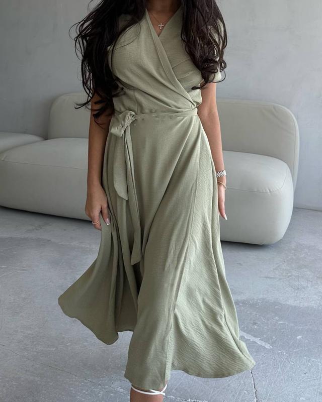 /// Сукня міді на запах жіноча літня весняна оливкова сукня халат приталена а силуету з розрізом на спідниці з V образним декольте жатка 🔥 Сукня на запах мод.1140 тканина: жатка розміри: 42-44, 46-48 кольори: оливка Ціна 815 грн Є відео огляд