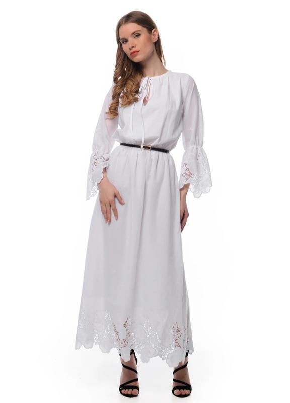 Сезонность-Лето Цвет - Белый Состав-100% хлопок Стиль–Кежуал Длина изделия-Миди и ниже колена Фасон-Клеш Фасон рукава-Вшитый Длина рукава-Рукав 3/4 Воротник-Круглый вырез Крой-Прямый Декор-Вышивка ришелье Фактура–Гладка Узор-Однотонный Застежка-На завязках Страна производства-Украина Вес, кг-0,3 кг Если нужно кину дополнительные фото в личные сообщения