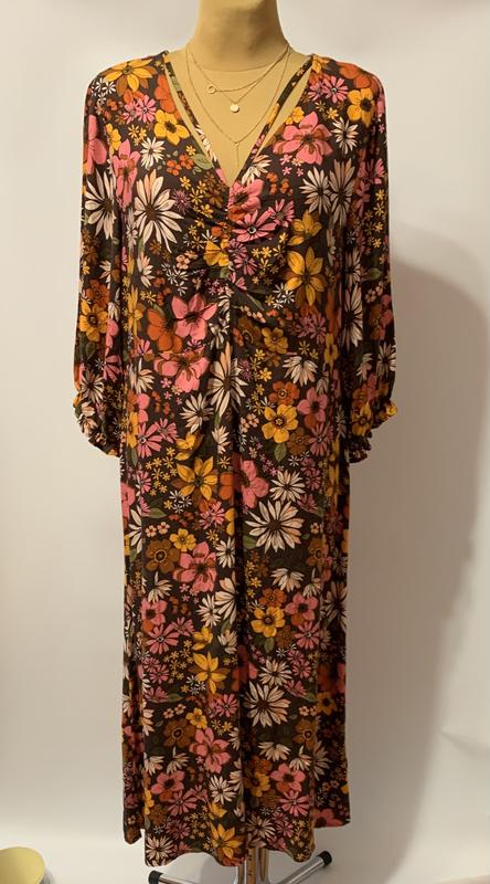 Шикарне квіткове плаття міді з об'ємними рукавами на резинці по низу,по грудях призбиране,легка літня тканина з актуальним принтом в квітах середнього розміру.Стан ідеальний,без дефектів.Розмір вказаний 20,але дивіться за вимірами Заміри (напівобхват): По плечах 40 см Груди 57-58 см Талія 48 см(тягнеться до 53см,гумка) Стегна 62-64 см Рукав 45 см, ширина 23 см Довжина від плеча 128 см,до шва 42 см Арт 4878