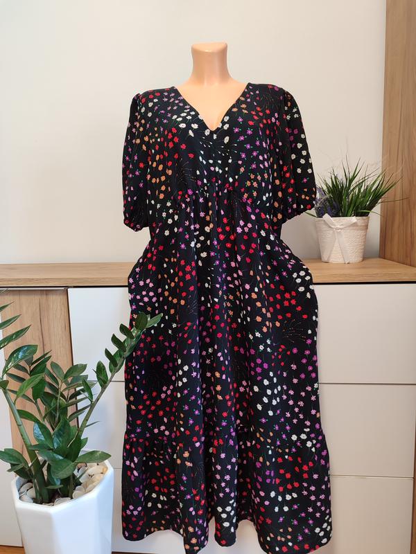 Милый принт, красивые разноцветные цветы на черном фоне, комфортный и базовый фасон! Длина 127, ПОГ 60, ПТ 49, бедра свободные, ПОБ 68. Подписывайтесь ко мне, есть много хороших вещей и обновление товара почти через день!