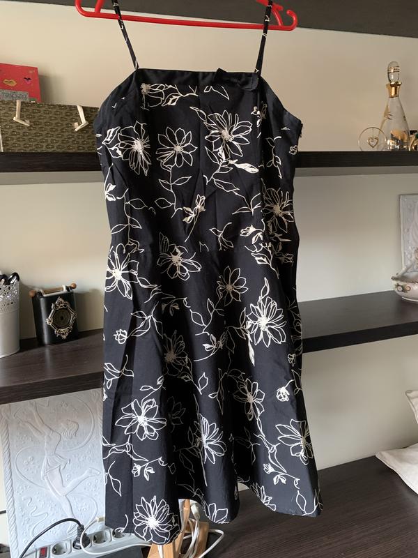 Сукня котонова нова та дуже стильна, шикарна і лягає на тіло чудово бо ще має єластан який мяко тут працює, чорно- кремові стилізовані квіти не великі акцентні, довжина сукні-97 см. від плеча, на зріст-1.63 буде закривати коліно, фото на мені і я ношу Мку, думаю на Л теж чкдово ляже, Пог-47-49, змійка глибока збоку тому зручно надягати. Запитуйте і не пошкодуєте за цю річ, на всі част💕❣️