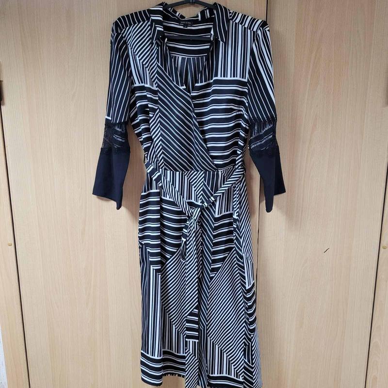 Платье на запах и поясом , отрезное по талии, на юбке имитация запаха, на рукаве вставка прозрачное кружево.сбоку змейка.Цвета черный, белый. Новое, без бумажной этикетки, люкс сток. Ог 100, талия 88-, Об 104, рукав 46, длина 109.