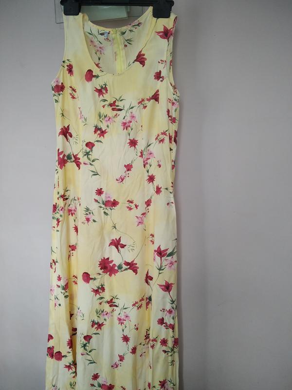 желтая в цветы, на спине молния, 100 вискоза, длина-133, пог-47, пот--41, поб-56