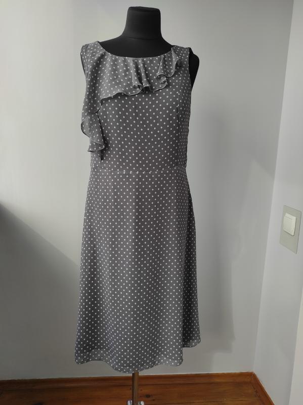 Платье миди в горошек 14 р Размер - 14 маломерит Цвет - серый основной, белый горошек 100 % полиэстер Материал - шифон, не тянется, не мнется Полностью на подкладке Застёжка сбоку потайная молния Длина - 105 см, Длина до талии - 40 см, пог - 51 см, пот - 44 см, поб - 60 см плечо - 6 см.