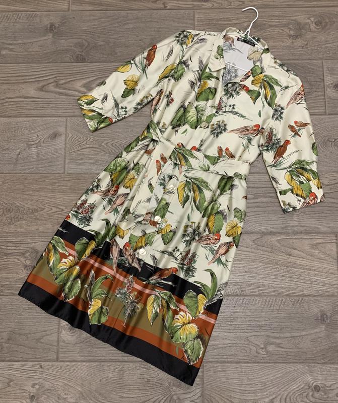 Сукня-сорочка міді Zara р. L/40/12 100% поліестер. Бірки зрізані. ПОГ 53 см ПОТ 56,5 см ПОБ 63 см Рукав 43 см Довжина по спині 108 см К-28