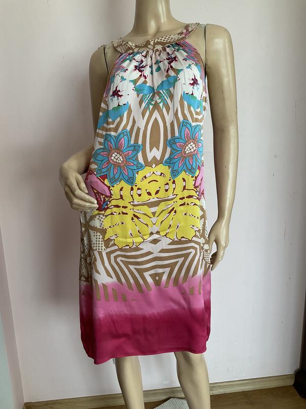 Тканина невагома. Без подкладки. Зад e растяжки так как низ и принт не заметно в носке. Замеры в груди 48 см в бёдрах 53 см длина 96 см 11:6:24