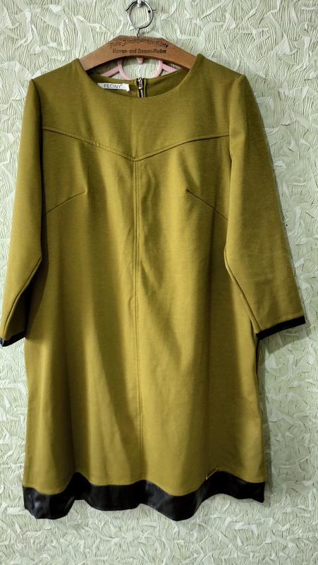 платье оливкового цвета, на бирже размер 4хл, где-то 54-56 р. в идеальном состоянии. есть карманы по бокам. низу платья и рукава манжеты из заменителя кожи. замеры по груди -54-64 по бедер -57-67 см плечи 40 см длина рукава 50 см Длина платья 57 см