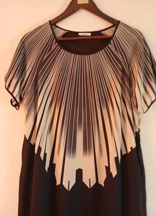 Оригинальное летнее платье, черное, верх имеет красивый бежевый рисунок. прямой силуэт, красиво садится, за счет рисунка делает стройнее и выше. Шифон на подкладке. Длина 100, ПОГ 56, Пот 56, Поб 58. Рукав от горловины, 32 см.