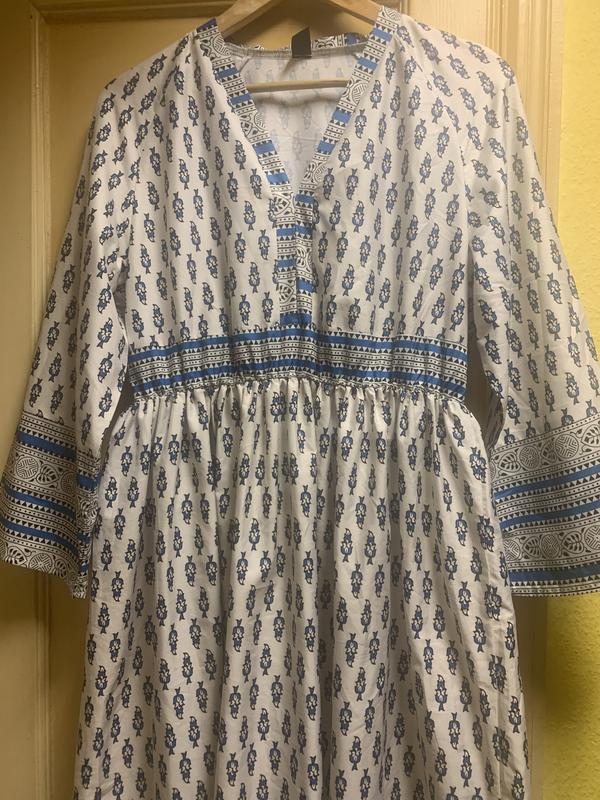 Платье белое с голубым, не тянется (кроме талии), не светится Линия талии немного завышенная, на резинке, тянется, дальше свободное. Бирки со складом ткани отсутствуют, по ощущением-софт Размер указанный L, можно больше Замеры: ПОГ под подмышками-52, линия отреза резинка-36-52, бедра свободно, длина от плеча-120 Нюанс: немного распустился шов в начале выреза ( последнее фото) Разгружаю собственный шкаф, не секонд. На все мое вещи возможен адекватный торг Дополнительные фото и замеры снастью, на вопрос ответьте
