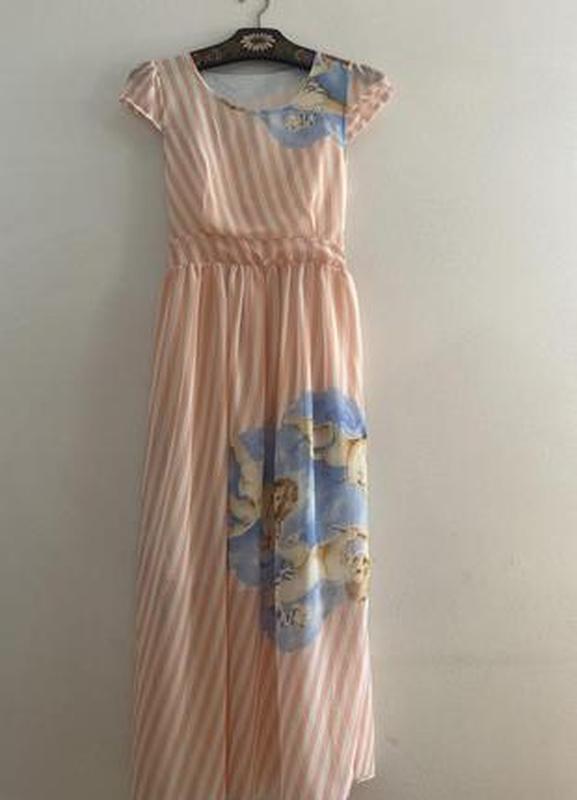 Стильне,літнє плаття з принтом. Є підкладка. Бірки зрізані-тканина поліестер. Без дефектів. Довжина від плеча 121 Плечі34 Рукав 9 Пог 40-45 Пот резина 31-35 Бедра вільно