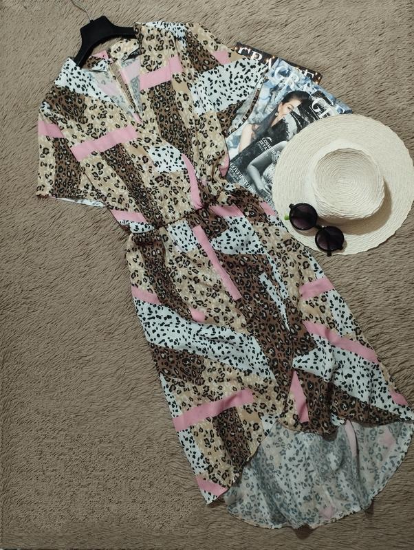 В идеальном состоянии. Красивое асимметричное платье миди на запах. Запах сшит. Тканина легка, не тягнеться. Есть карманы. Выглядит супер 😍 Размер 16/44/2ХL, но смотрите по замерам Замеры (полуобхват): Груди 57 Талия 41 (тянется до 51) Стегна 58 Длина от плеча спереди 90/сзада 118