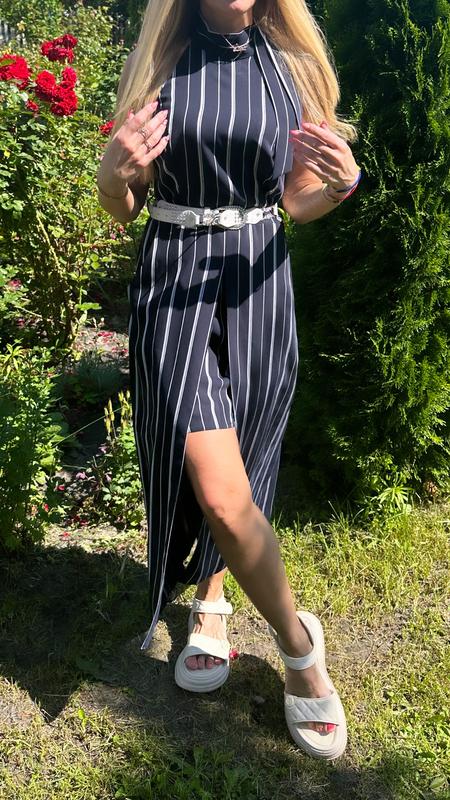 Понизу спідниця іде коротка а наверху подовжена по боках має кишені на бірці розмір вказаний 10 довжина від плеча коротшої спідниці 88 довжина повністю 128 сантиметрів застібається посаду від шиї по спинці до низу ширина в грудях спокійному стані 45 сантиметрів ширина в талії в спокійному стані 40 сантиметрів ширина в бедра спокійному стані 52 сантиметри тканина щільна не тягнеться На поясі є лямки для пояса такого ж ремінця в комплекті не має але подарую того що на фото
