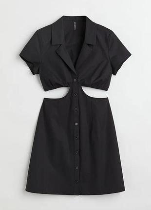 Короткое платье-рубашка из плотного хлопкового поплина. V-образный вырез с узкими лацканами, пуговицами спереди и короткими рукавами. Вырезы на талии с узкой обтянутой резинкой сверху, частично открытая спина и слегка расклешенная юбка. Без подкладки. Бренд: H&M Цвет: Черный
