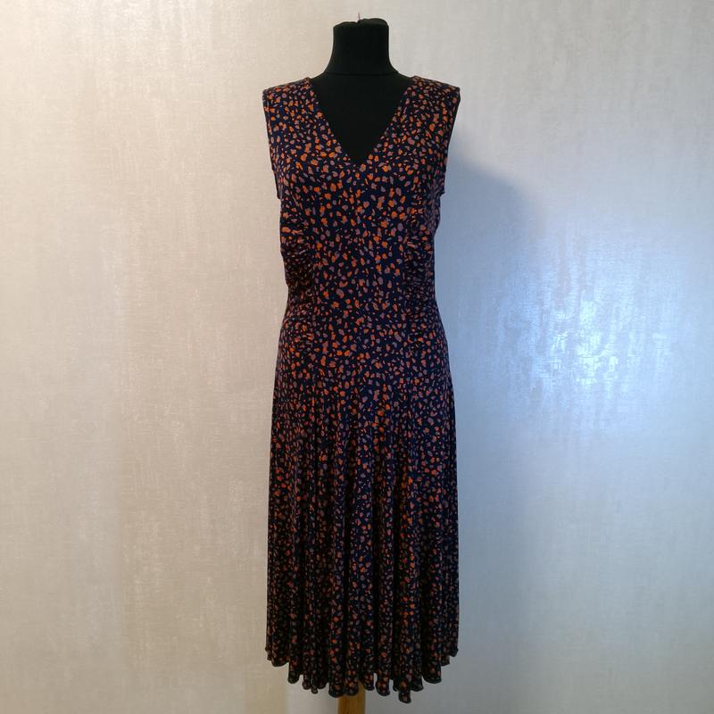 Платье в идеальном состоянии, похоже совсем не носилось. Бренд очень качественный, ткань в виде масляной, очень красиво садится по фигуре, ниспадает, и развевается при ходьбе, в составе вискоза и немного эластана. Очень удачный крой который подчеркнет фигуры и скроет недостатки, по бокам ткань присборена и это удачно скроет все что надо скрыть, юбка полусолнце. По наборке это размер S, но она немного болеемерит, потому что красиво деревянная на М гг., еще надо учитывать что ткань красиво тянется. Замеры в спокойном состоянии: длина 112 см, по груди 84 см, талия 74 см, по бедрам свободно.