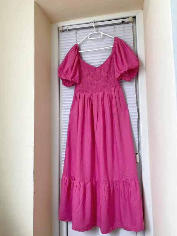 Нереальної краси сукня міді в розмірі 14 Верх повністю на резинкі, тягнеться В складі три натуральні тканини: льон, котон, віскоза Колір фуксія Рукава обʼємні, фонарики Якість топова🔝