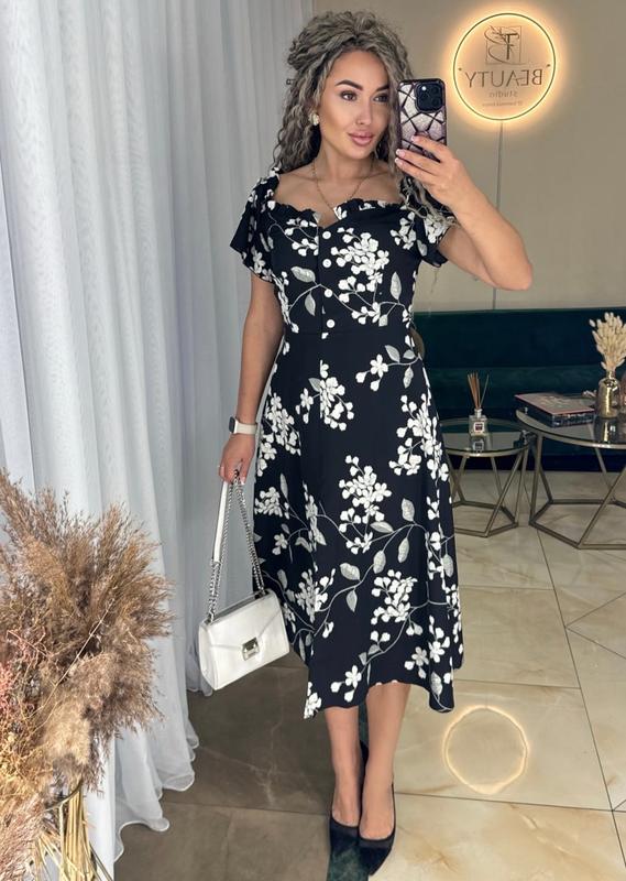 🖤💕🖤 СУКНЯ 🖤💕🖤 Арт. SV 537 Ткань: евро-софт Цвет: черный Размеры: S, M, L, ХЛ Описание: Трендовое платье с разрезом. Модель миди длины с открытыми плечами и с рюшами на груди. ( замеры указаны на параметры)