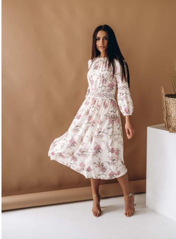 Нежное платье с кружевом на талии и рукавах. В цветочный принт, ткань: арганы шифон + трикотажная подкладка, длина-миди.