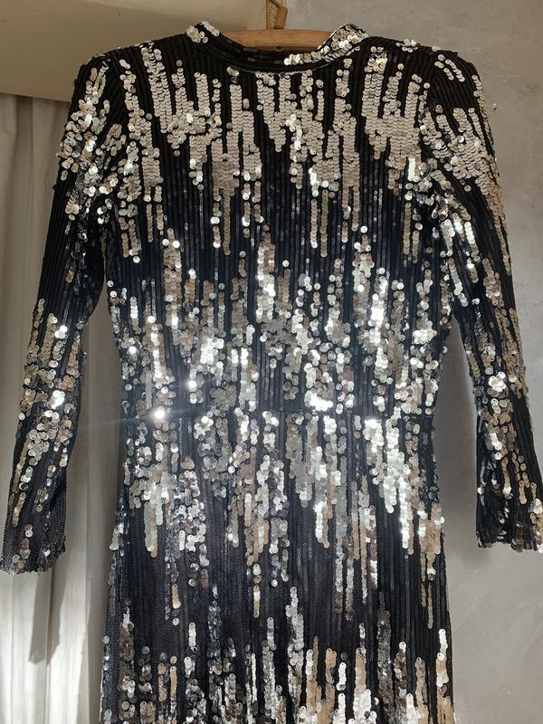 Неймовірно красиве плаття. На чорній трикотажній сітці розшито різними паетками ( маленькі чорні, великі срібні). Плаття має трикотажну підкладку по всій довжині і по рукавах. Тканина тягнеться. Ззаду на шиї застібається на гудзик ПОТ 35 тягнеться до 40см ПОГ 40 тягнеться до 50 см ПОБ 45 тягнеться до 54см Довжина рукава 51 см Довжина плаття 91 см Плаття в ідеальному стані, було одягнену всього один раз на святковий захід. При потребі, кину фото як воно виглядає по фігурі вживу)