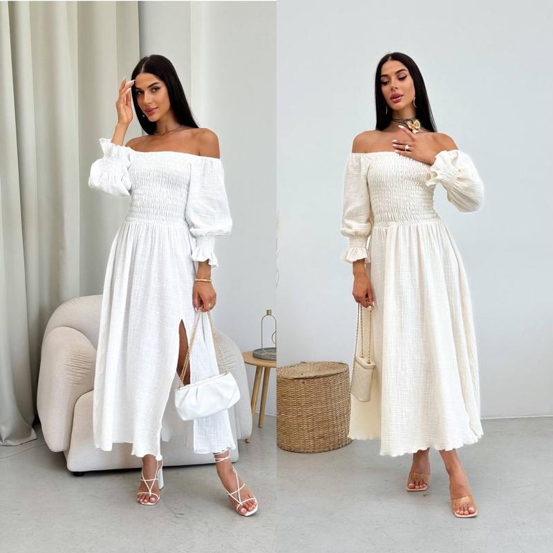 Ніжна бавовняна сукня 🕊 Модель 7030 ▫Тканина: льон-муслін , хлопок 100% ▫Розмірний ряд : 42-46, 48-52 ▫Кольори: беж та молоко ФОТО РЕАЛ Ідеальна легка сукня на резиночці, з розрізом на нозі🥰 Ідеально підійде під будь-яке взуття , дуже легка та зручна 💌 Можна носити із закритим та розкритим плечем🌸 Під загорілі ніжки - саме те 🌞