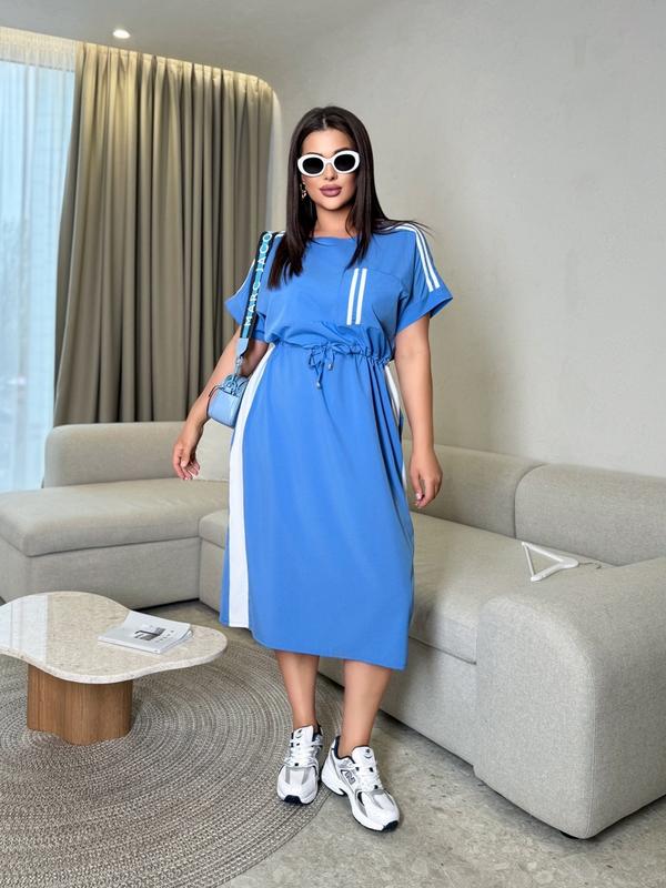 Розміри: 1(48-50),2(52-54),4(56-58) Тканина: софт Заміри: Сукня прямого сілуєту (48-50)-ОГ 112 см, ОС-120 см (52-54)-ОГ 120см, ОС-128см (56-58)-ОГ 128 см, ОС-136 см Довжина рукава від горловини 28см Довжина по спинці 113 см Сукня вільного крою , прикрашена вшитим паском та тендітно підкреслює талію св