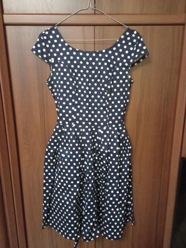 Платье темно-синее в белый горох, в красивом состоянии. Сзади молния по всей спине до уровня бедер, пояс - завязывается в виде банта. Приталенное, на поясе юбка с складочками. длина платья - 94см, полуобхват в груди - 42см, полуобхват в талии - 35,5см. Благодаря поясу, который завязывается в виде банта - можно регулировать талию. Тканина трохи стрейчева, тягнеться.